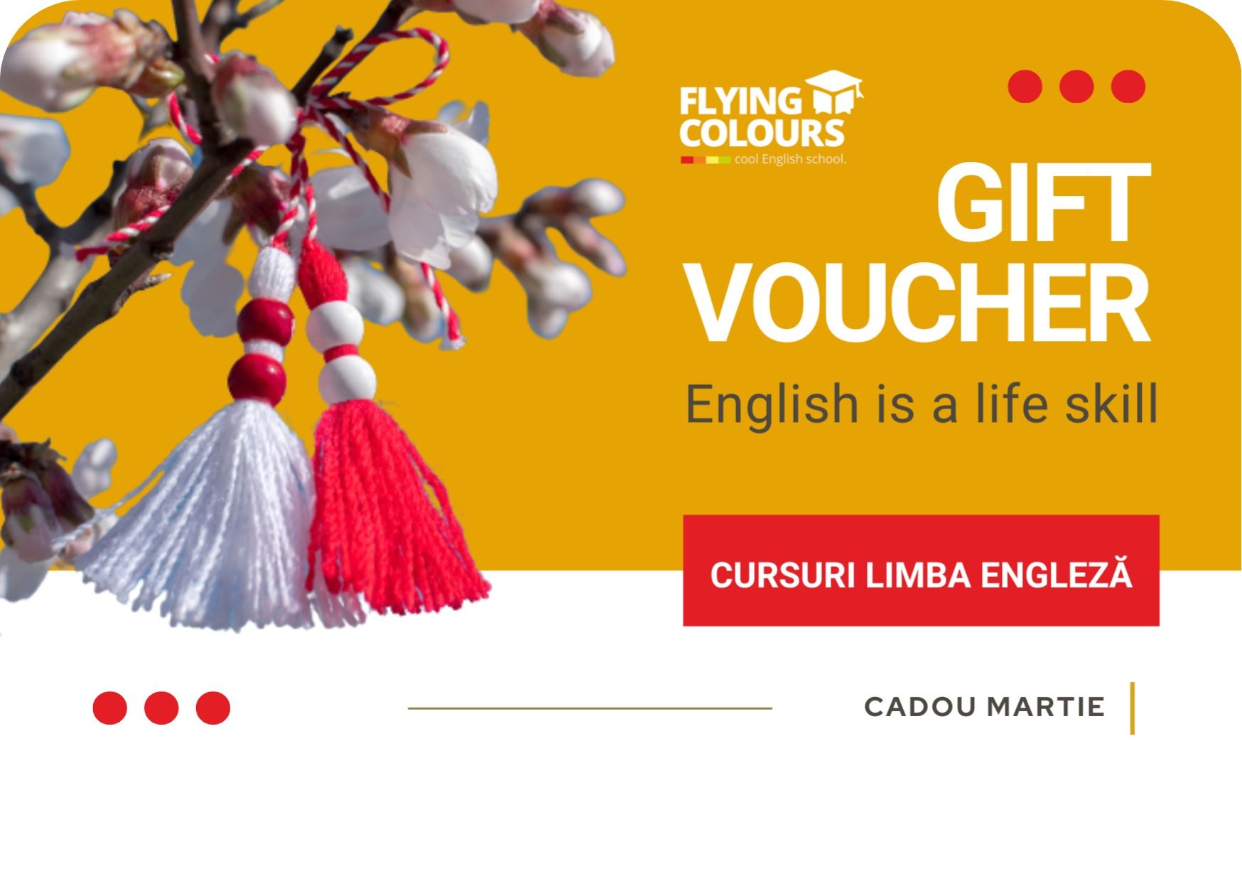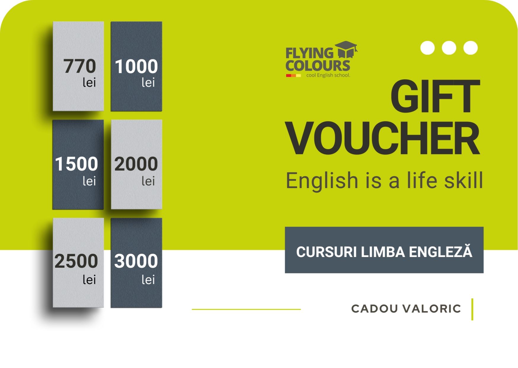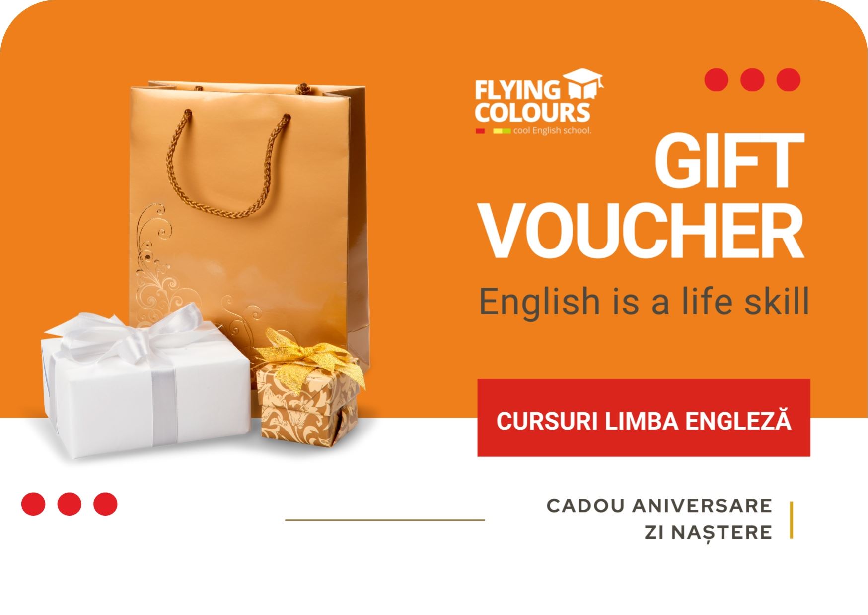 Dacă ești deja cursantul nostru, poți procura gift voucherul de la centrul Flying Colours. Dar nu este obligatoriu – îl vei putea cumpara și direct de pe site, online, sau printr-un simplu telefon sau e-mail. Poți alege dintre voucherele cadou dedicate unei sărbători anume (Martie, Valentine’s Day, Paștele sau sărbătorile de iarnă), voucherul cadou de aniversare, cardul cadou destinat sectorului corporate sau, pur și simplu, un voucher valoric de la 770 la 3.000 de lei (poți decide asupra sumei pe care vrei să o dăruiești).